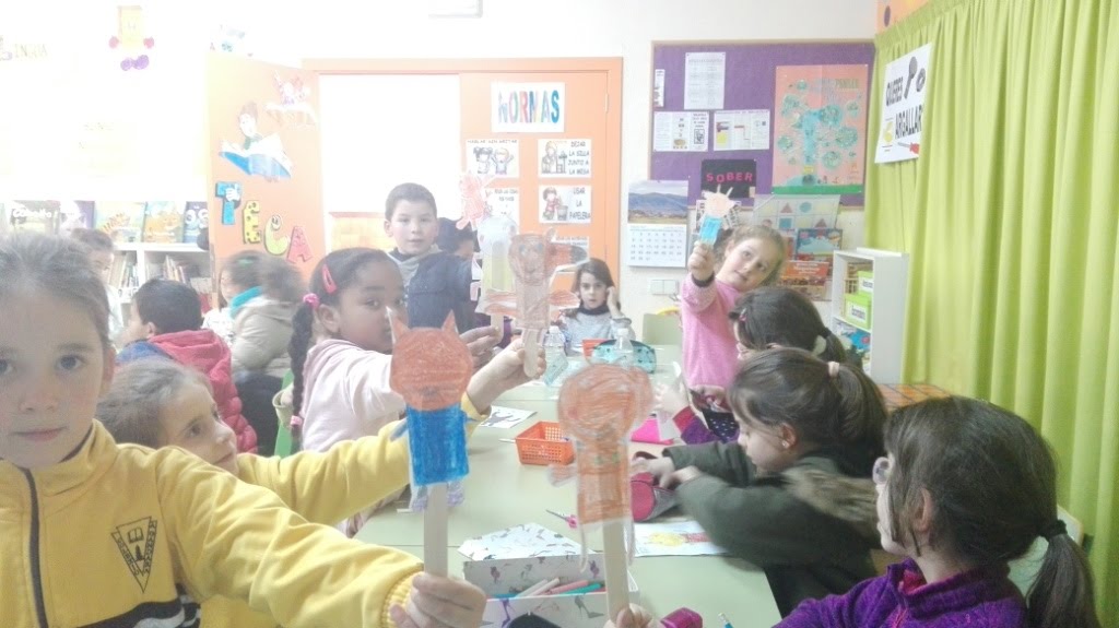 Despois da visita, compartiron con nós o xantar e un taller de ilustración na biblioteca impartido por Iria Iglesias e Dani Viéitez de estudio Gnomo (autores, entre outros, da colección O raposo Rufo) no que aprendimos moito sobre a ilustración pero tamén houbo contacontos, aprendizaxe sobre a reciclaxe e reutilización de residuos e creación de personaxes propios que tomaron vida en forma de monicreques.